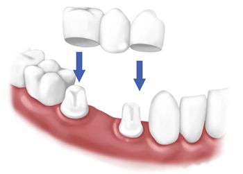 A crown is a covering that encases the entire tooth surface restoring it to its original shape and size. A crown protects and strengthens the remaining tooth structure. This type of bridge is made of porcelain and is cemented permanently to natural teeth adjacent to the missing tooth site. The benefit of this type of bridge is that it is fixed (not removable) and it is very sturdy. The disadvantage is that in order to create a fixed appliance, two healthy, natural teeth will have to be crowned (capped) to hold the bridge in place.
